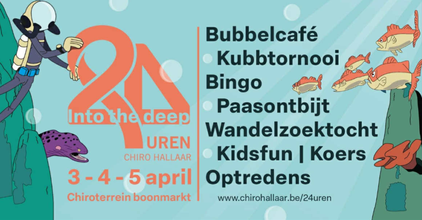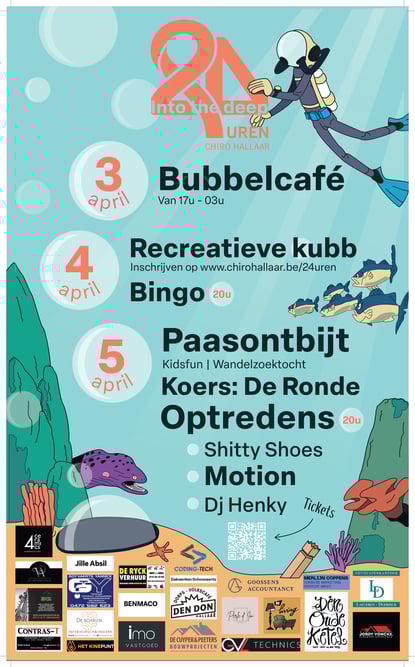 Duik mee in een weekend vol plezier en avontuur! Tijdens het Paasweekend van vrijdag 3 april t.e.m. zondag 5 april verandert onze Chiro in een betoverende onderwaterwereld. Verwacht golven van